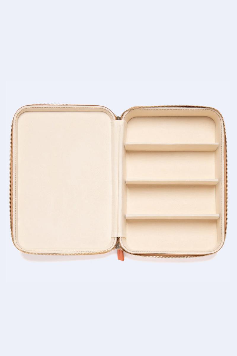 Collector's Case fra Garrett Leight gjør det enkelt å oppbevare brillegarderoben, med plass til opptil fire briller. Den er foret innvendig slik at brillene er beskyttet, og den har en dobbel glidelåslukking som gjør at den også er praktisk å ha med seg på reise.