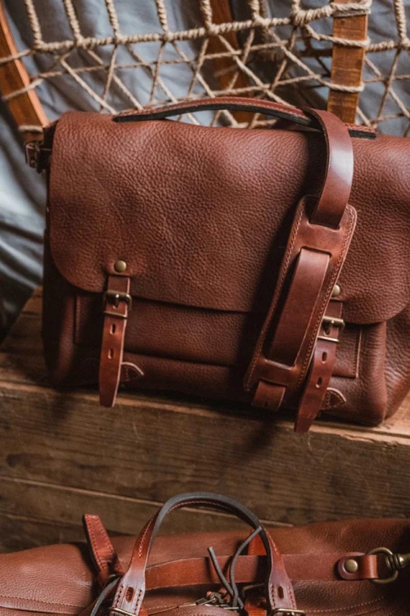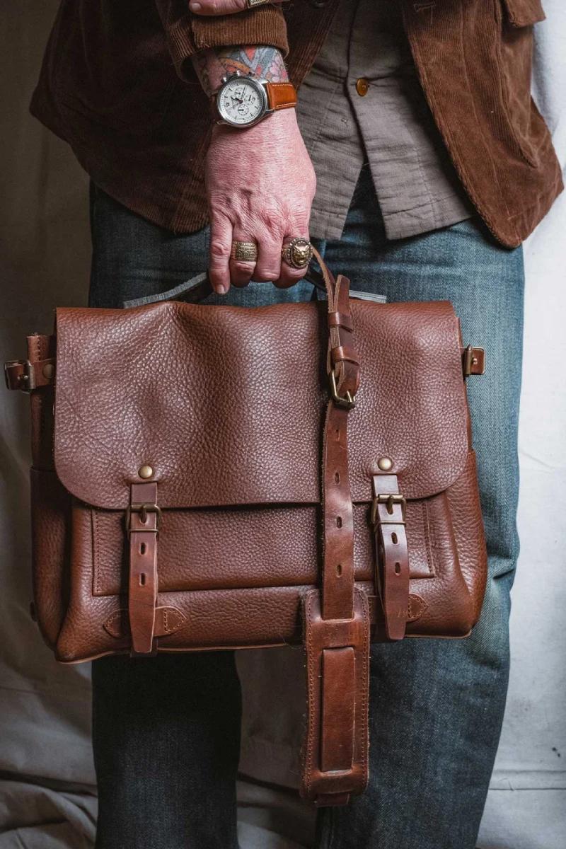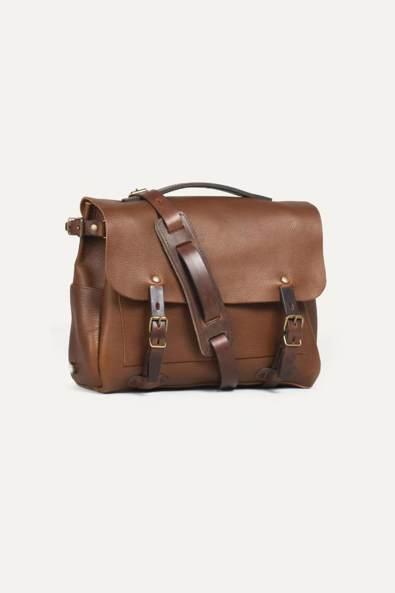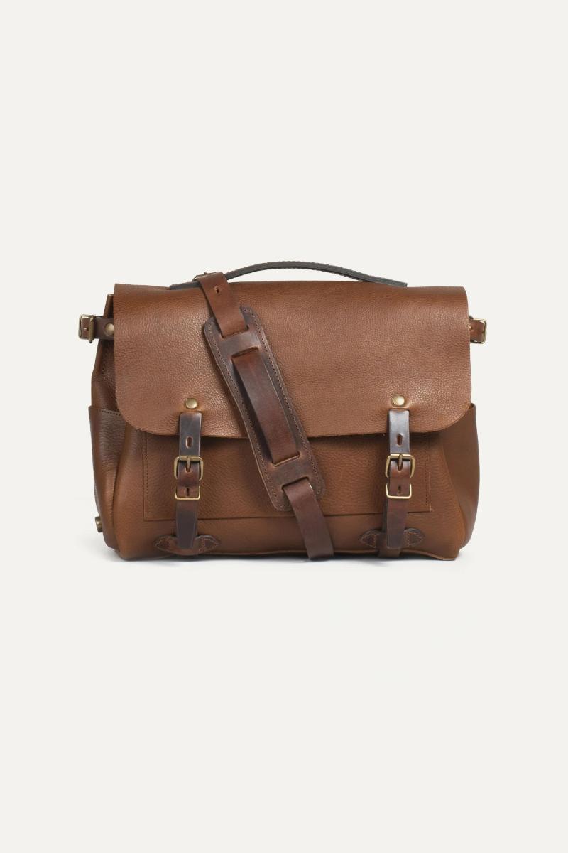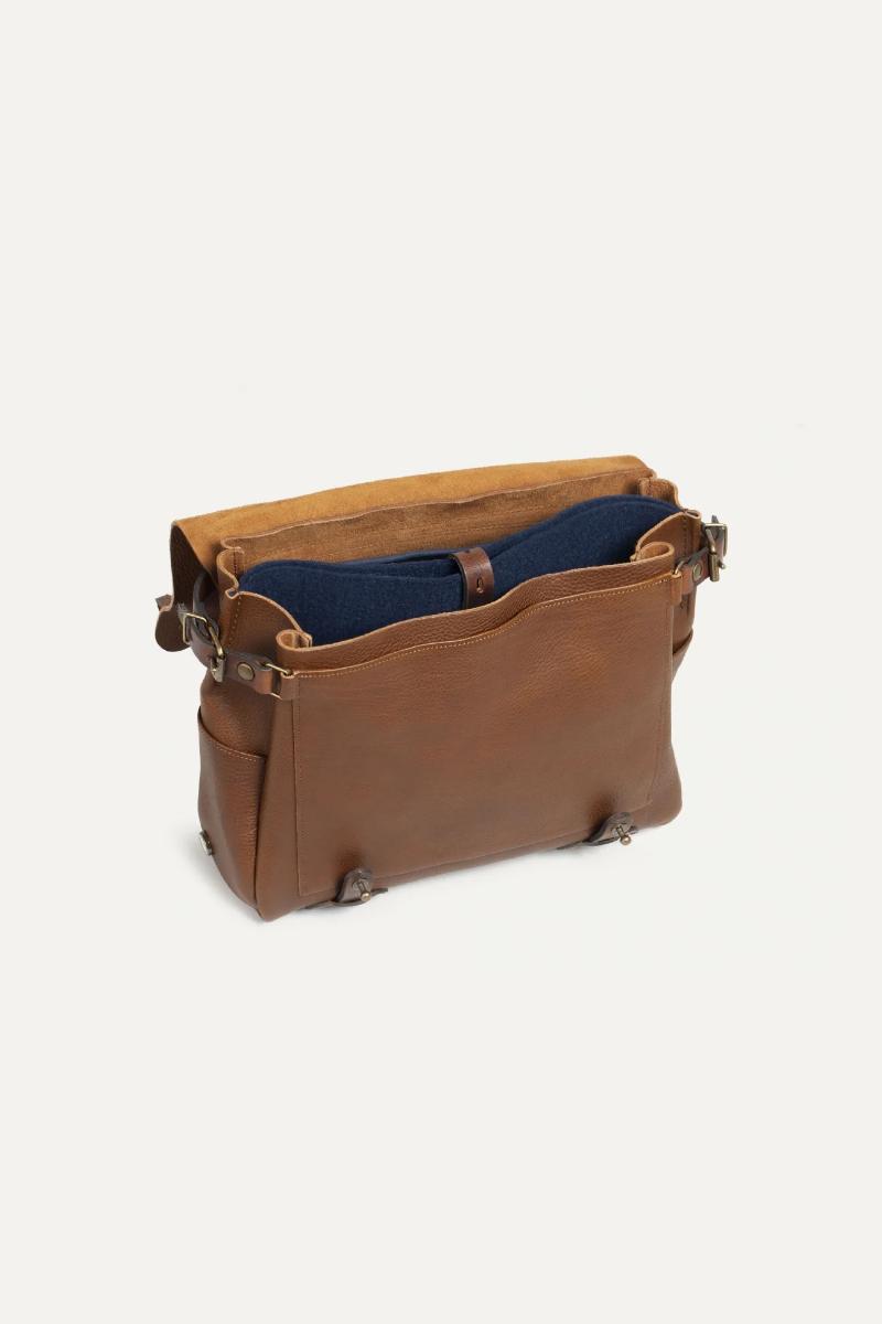 Skulderveske i vegetabilsk garvet skinn fra Bleu De Chauffe. Vesken har en avtagbar reim med skulderpute i skinn. Innvendig har den en polstret lomme med plass til en bærbar datamaskin på opptil 13 tommer, samt en lomme med glidelås. Utvendig har den tre lommer. Håndlaget i Frankrike.