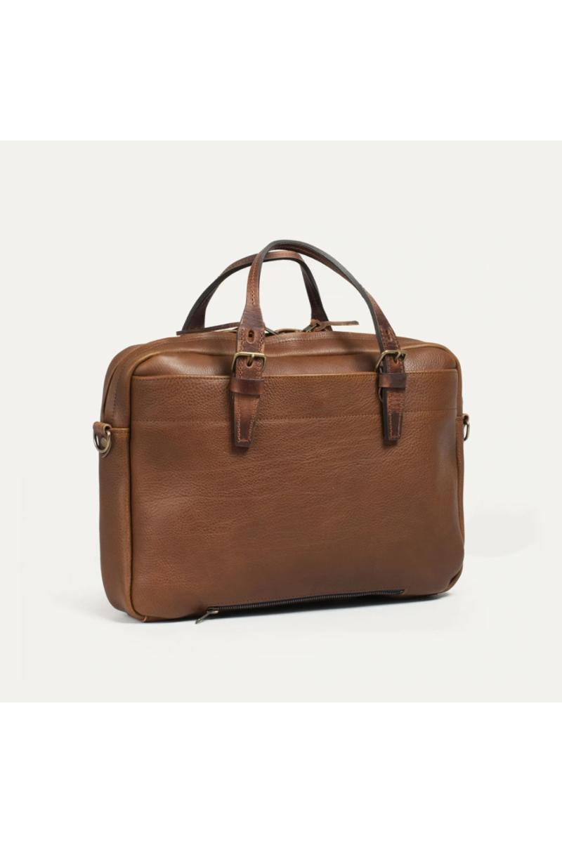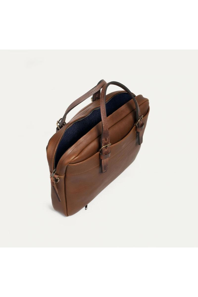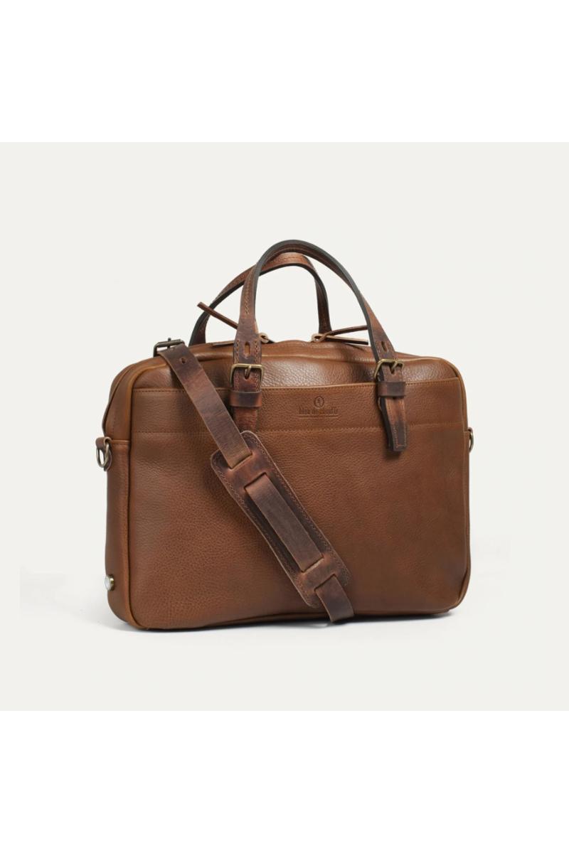 Arbeidsveske i vegetabilsk garvet skinn fra Bleu De Chauffe som kan bæres i hånden eller over skulderen. Vesken har flere smarte funksjoner som gjør hverdagen enklere: et innebygd rom for en 16-tommers bærbar laptop, en innvendig glidelåslomme og to utvendige lommer. Vesken kommer også med en avtagbar lærreim som har en behagelig skulderpute i skinn foret med naturlig filt. Når man er ute på reise kan glidelåslommen på baksiden festes til koffertens teleskophåndtak.