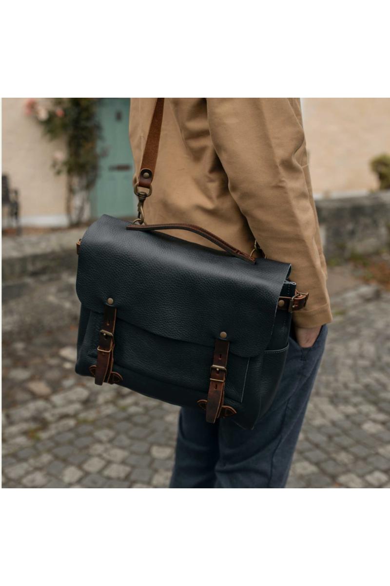 Skulderveske i vegetabilsk garvet skinn fra Bleu De Chauffe. Vesken har en avtagbar reim med skulderpute i skinn. Innvendig har den en polstret lomme med plass til en bærbar datamaskin på opptil 13 tommer, samt en lomme med glidelås. Utvendig har den tre lommer. Håndlaget i Frankrike.