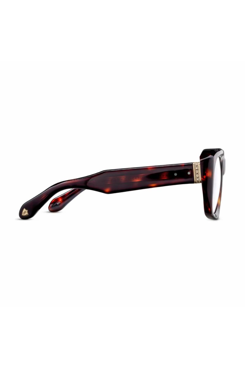 M1036-innfatningen fra Matsuda er et statement innenfor håndverk og design. Innfatningen er laget av kraftig, håndskulpturert japansk acetat, og har signaturgraverte titantråder som gir et intrikat, kunstnerisk preg. De spesialtilpassede hengslene med 7 løp sikrer holdbarhet og presisjon, samtidig som de visualiserer Matsudas dedikasjon til å forene tradisjonell kunst med moderne teknikker.
