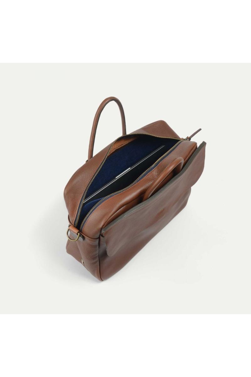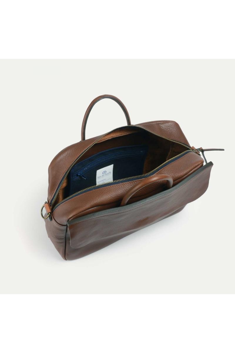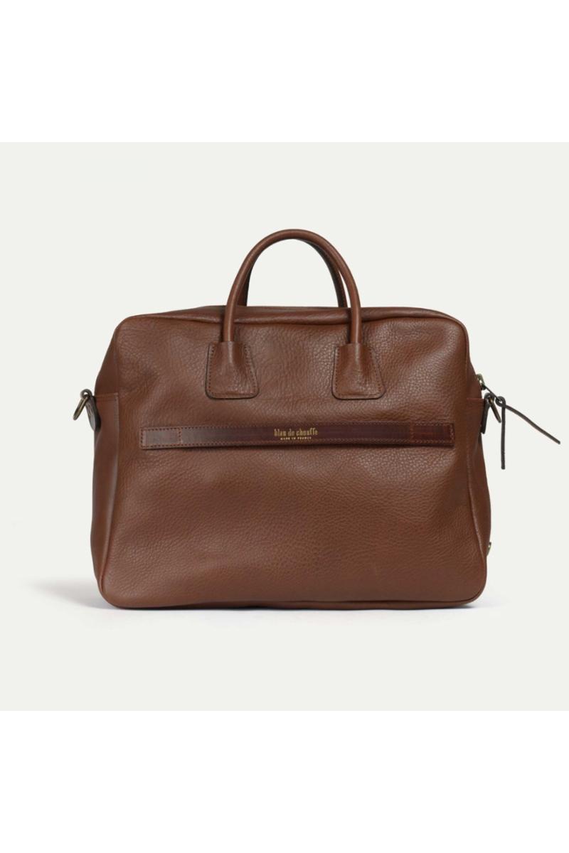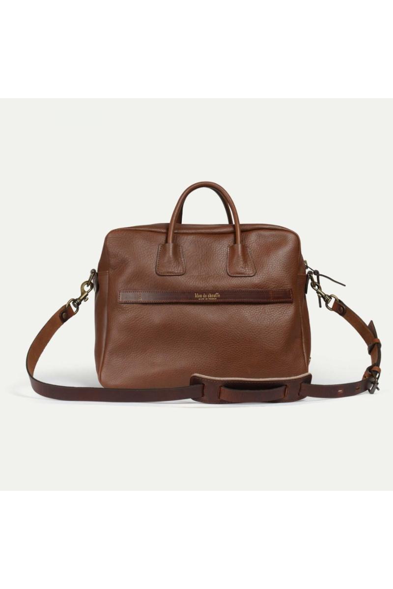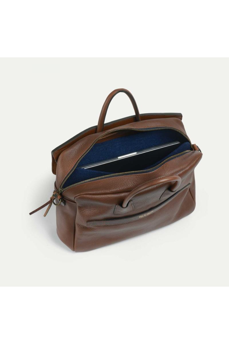 Arbeidsveske i vegetabilsk garvet skinn fra Bleu de Chauffe. Innvendig er det et romslig rom, en lomme i filt for laptoper opptil 16 tommer, og en liten glidelåslomme i bomull. Utvendig er det en praktisk lomme med klaff, perfekt for et magasin eller en notatbok, sikret med en gjennomgående vintage-lukking gravert med Bleu de Chauffe-logoen. En liten lomme foran, lukket med magnetisk topp, er perfekt for å holde alle dine viktigste ting lett tilgjengelig: nøkler, lommebok, mobiltelefon og mer.