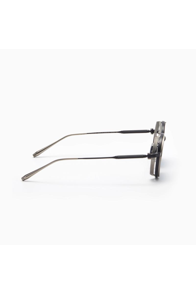 Rund solbrille i japansk titan fra Akoni med en innovativ kombinasjon av to titaninnfatninger. Den skarpe kontrasten mellom rike matte toner og skimrende edle metaller skaper et sofistikert og unikt uttrykk. Sideskjoldets fengslende mønster av sirkler minner om Akoni-logoen.
