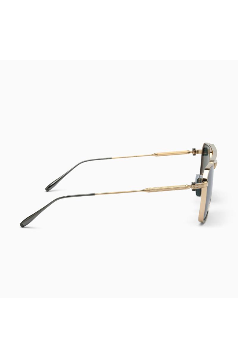 Solbrille med en firkantet pilot-form fra Akoni. Den kantete formen komplementeres av en teksturert toppstang, kontrasterende overflater på hengslene og stangtuppene, og raffinerte detaljer som riflede Akoni-stenger.