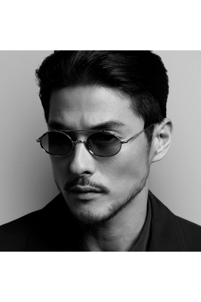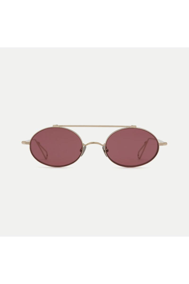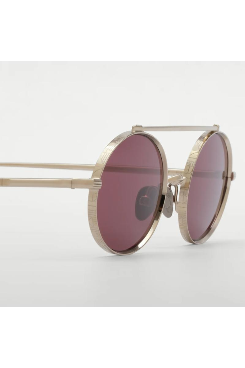 Oval solbrille i delikat metall fra Ahlem som balanserer myke former og rette linjer. På kanten av innfatningen er det inngraverte geometriske former, inspirert av Bauhaus.