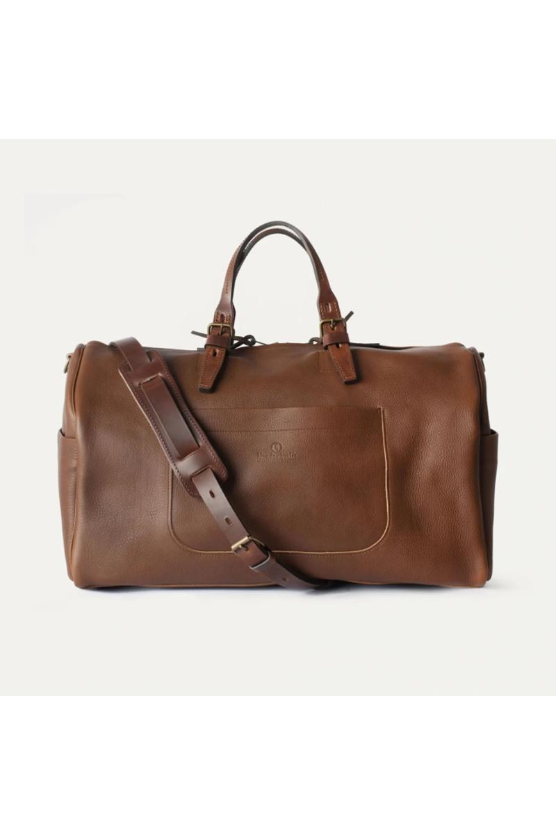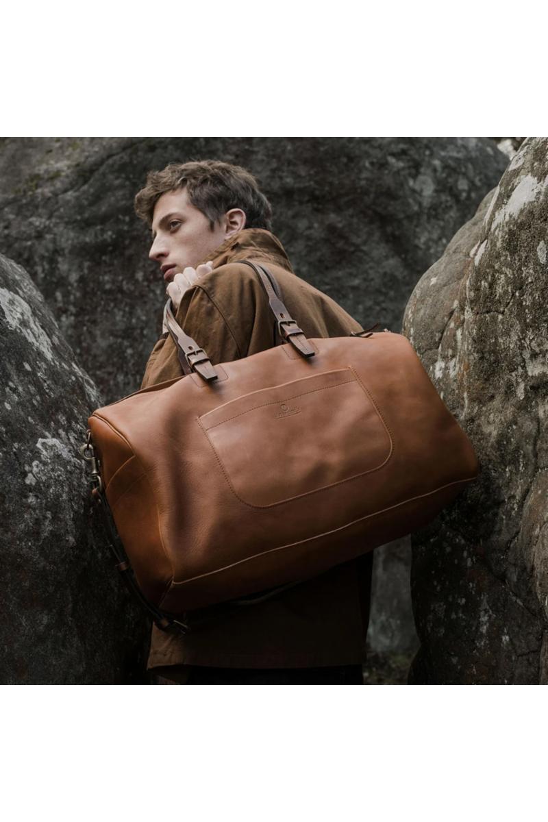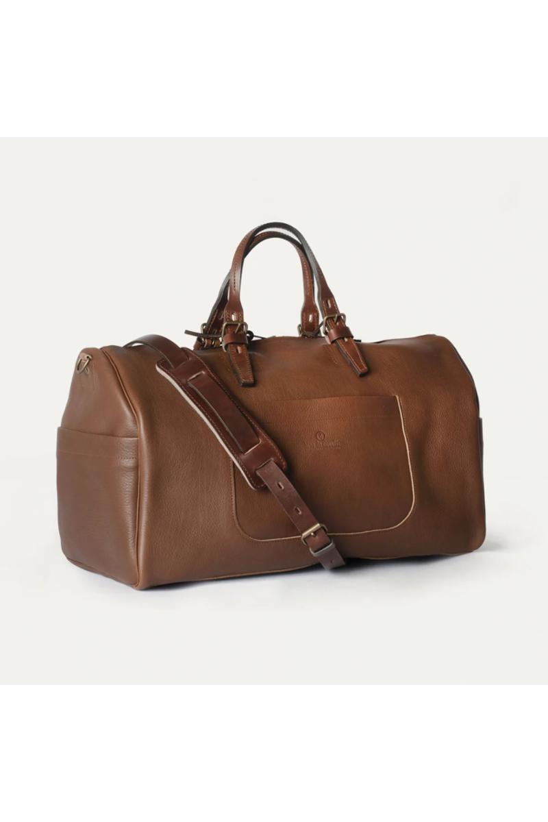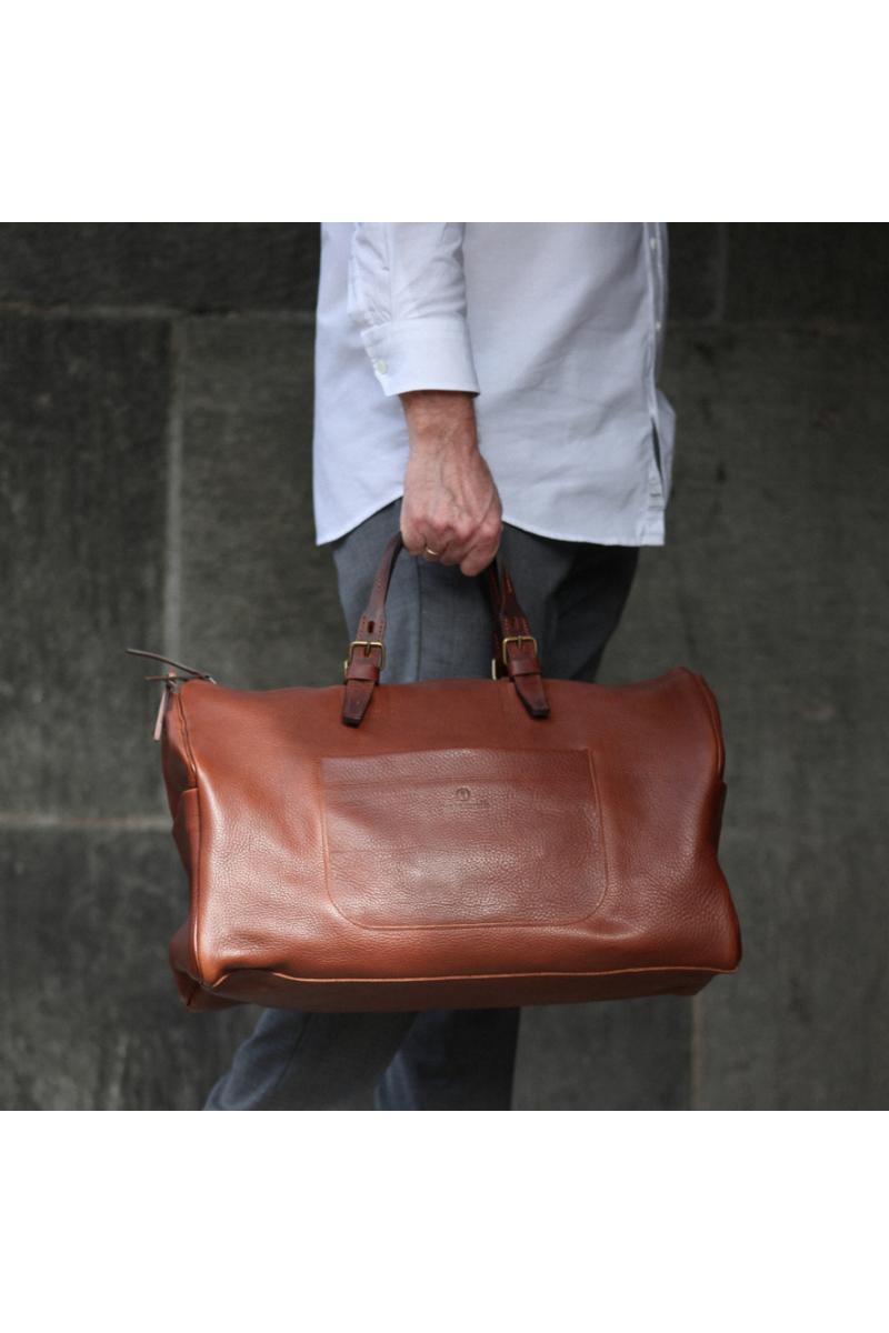 Hobo Travel Bag rommer omtrent 30 liter og er ideell til bruk for både korte og lange turer. Bagen er laget av vegetabilsk garvet skinn. Den har en utvendig lomme på forsiden for oppbevaring av f.eks lommebok, notatblokk eller mobiltelefon, samt to sidelommer. Innvendig har bagen en avtagbar glidelåslomme. Håndtakene er justerbare, og det følger også med en lengre avtagbar skulderrem for bæring over skulderen. Bagen har glidelåslukking til hovedrommet.