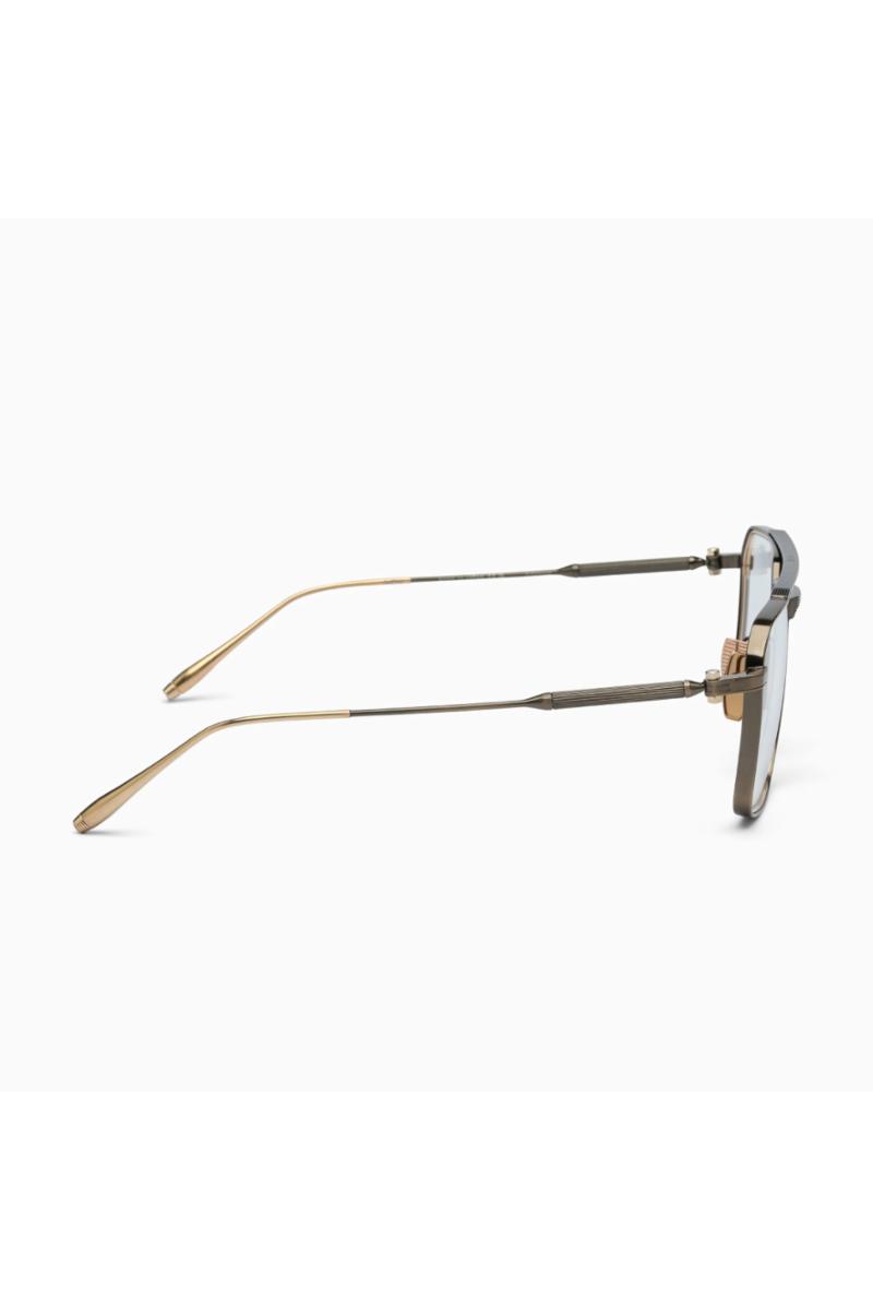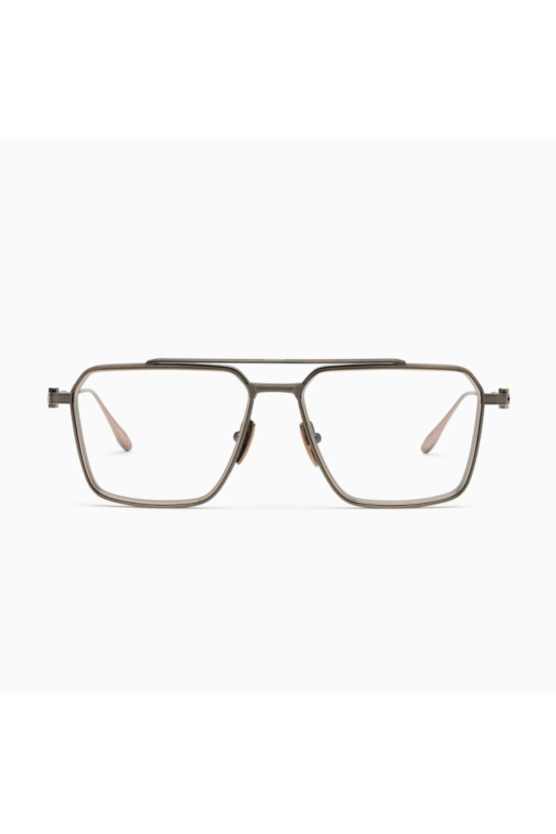 Brilleinnfatning med en firkantet pilot-form fra Akoni. Den kantete formen komplementeres av en teksturert toppstang, kontrasterende overflater på hengslene og stangtuppene, og raffinerte detaljer som riflede Akoni-stenger.